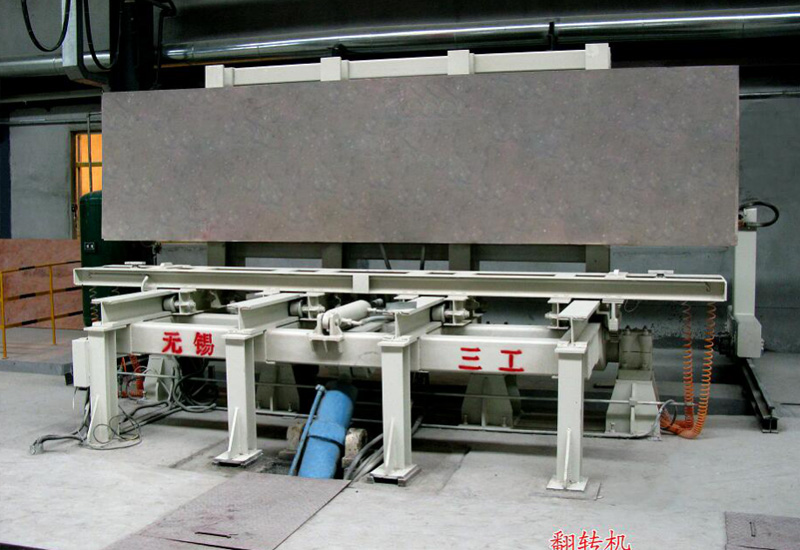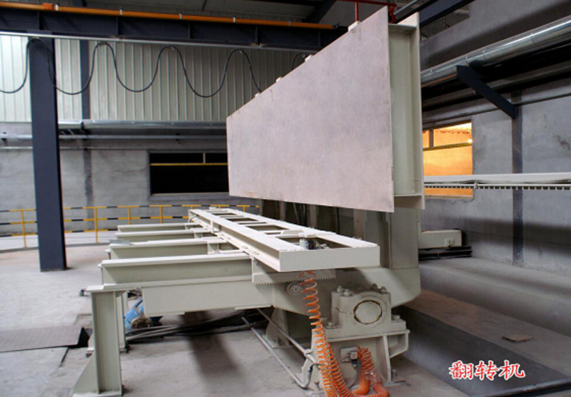 加氣磚成套生產線中用到的一種翻轉設備,翻轉臺,主要是加氣線里面,切割完成后,坯體經由翻轉臺90度翻轉,再刮廢料機刮除坯體頂部和底部的廢料。