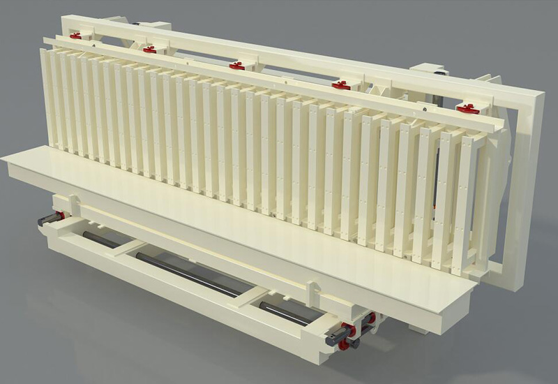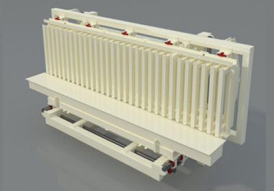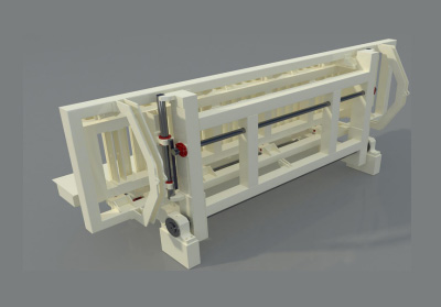 坯體切割底面會有一些廢料。翻轉臺將坯體在翻轉架上轉過90°后,坯體底面切割的表皮由水平位置轉變成垂直位置,在重力作用下,自動脫落,坯體表面廢料被去除。翻轉臺全部采用液壓驅動。翻轉油缸還具有終點緩沖性能。為了保證蒸養(yǎng)底板、側板在翻轉過程中的穩(wěn)固性,在它們處于翻轉位置時側面都設有鎖緊機構。